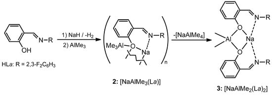 Finally, to have clear evidence regarding the formation of [NaAlMe4], the reaction between the alkali metal compound [NaLa] with two equivalents of trimethylaluminium (AlMe3) was performed (Scheme 4) [56]. In this reaction, the aluminium derivative [AlMe2(La)] was clearly identified, which proves the possibility of ligand rearrangements in these systems. Confirming this, a signal at δ-0.40 ppm attributable to [NaAlMe4] could also be detected (Figure S3).