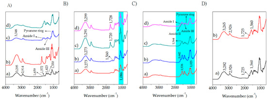 FTIR spectra for BAPS. (A). Polymers with and without lactic acid and glutaraldehyde (ADD): (a) PVA; (b) PVA/ADD; (c) CHI; (d) CHI/ADD. (B) PVA blends: (a) PVA/AMP 0.3%; (b) PVA/AMP 1%; (c) PVA/ADD/AMP 0.3%; (d) PVA/ADD/AMP 1.0%; (C) CHI blends: (a) CHI/AMP 0.3%; (b) CHI/AMP 1.0%; (c) CHI/ADD/AMP 0.3%; (d) CHI/ADD/AMP 1.0%; (D) PVA/CHI blends: (a) PVA/CHI/ADD/AMP 0.3%; (b) PVA/CHI/ADD/AMP 1.0%.