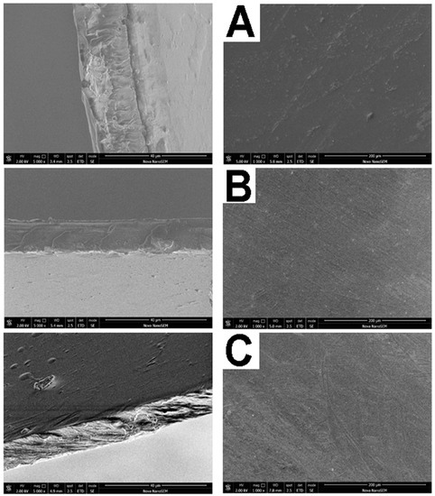 Cross section and surface SEM images of the Bioartificial polymeric systems (BAPS): (A) PVA/ADD/AMP. (B) CHI/ADD/AMP. (C) PVA/CHI/ADD/AMP.