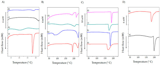 Thermogram for BAPS. (A). Polymers with and without ADD: (a) CHI; (b) CHI/ADD; (c) PVA; (d) PVA/ADD; (B) PVA blends: (a) PVA/AMP 0.3%; (b) PVA/AMP 1%; (c) PVA/ADD/AMP 0.3%; (d) PVA/ADD/AMP 1.0%; (C) CHI blends: (a) CHI/AMP 0.3%; (b) CHI/AMP 1.0%; (c) CHI/ADD/AMP 0.3%; (d) CHI/ADD/AMP 1.0%; (D) PVA/CHI blends: (a) PVA/CHI/ADD/AMP 0.3%; (b) PVA/CHI/ADD/AMP 1.0%.