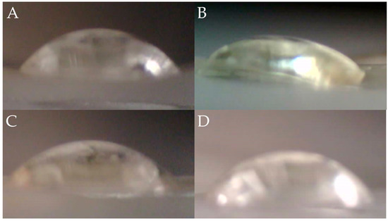 Images for contact angle measurements. (A) PVA/CHI/ADD/AMP 0.3% (ethylene glycol); (B) PVA/CHI/ADD/AMP 0.3% (diiodomethane); (C) PVA/CHI/ADD/AMP 1.0% (ethylene glycol) (D). PVA/CHI/ADD/AMP 1.0% (diiodomethane).