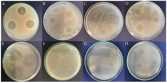 Inhibition zone for BAPS. (A,B) PVA/AMP 1.0% against Staphylococcus aureus and Escherichia coli. (C,D) PVA/ADD/AMP 1.0% against Staphylococcus aureus and Escherichia coli. (E,F) CHI/ADD/AMP 1.0% against Staphylococcus aureus and Escherichia coli. (G) PVA/CHI/ADD/AMP 0.3% against Staphylococcus aureus (H) PVA/CHI/ADD/AMP 1.0% against Staphylococcus aureus.