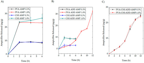 AMP shows an absorption peak in the region of 1730–1720 cm−1 (Figure 1B–D), which is caused by C=O β-lactam stretching. The peaks at 1664 and 1560 cm−1 belong to C=O amide stretching and -NH amide groups respectively [51]. By virtue of no other modifications in the spectra, it is plausible to infer that no chemical interactions are occurring between PVA and CHI with AMP, which might imply that the antibiotic can be released from the matrix and even that the structure does not suffer significant modifications and no alterations on the antibacterial activity of AMP whatsoever. The same features are evidenced in the spectra for CHI/ADD/AMP as well as PVA/CHI/ADD/AMP.