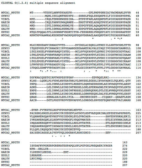 Multi-alignment of the amino acid sequences of the β-CAs from M. tuberculosis (isoform MTCA1_MYCTU), Synechocystis sp. (SYNY3), V. cholerae (VIBCL), H. influenzae (HAEIN), E. coli (ECOLI), S. typhimurium (SALTY), E. histolytica (ENTHI), and M. tuberculosis (isoform MTCA2_ MYCTU) [11,27,28,29,30]. Conserved amino acids depicted by an asterisk (*), semiconserved ones by (.) or (:).