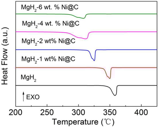 Differential scanning calorimetry (DSC) measurements were conducted to discuss the thermal decomposition properties of MgH2-x wt.% Ni@C composites (x = 0, 1, 2, 4 and 6) and the corresponding DSC curves in the temperature range from 200 °C to 450 °C (5 °C min−1 heating rate) are shown in Figure 1. It is evident that both the onset dehydrogenation temperature and dehydrogenation peak temperature gradually decrease with the increased Ni@C additive amount. Table 1 presents the exact values of the onset and peak temperatures which are shown in Figure 1. The exact values of the onset temperature in Table 1 are chosen at the intersection between the DSC plot and the baseline.