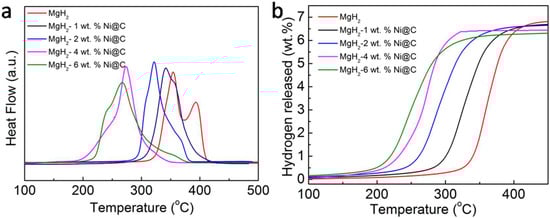 The temperature-programmed desorption (TPD) plots (a) and the corresponding thermally programmed H2 desorption capacity curves (b) of various MgH2-x wt.% Ni@C composites (x = 0, 1, 2, 4 and 6).