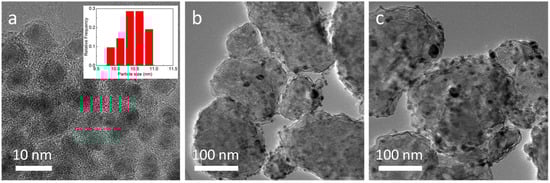 The morphology and micro-structural features of MgH2-4 wt.% Ni@C composites before and after dehydrogenation were characterized by transmission electron microscopy (TEM) analysis (Figure 3). Initially, the Ni@C materials depicted a core-shell microstructure with approximately a 10 nm Ni core and 5 nm carbon shell (Figure 3a). The size distribution (inset of Figure 3a) reflects a relatively uniform distribution. The carbon shell possesses many porous channels which are beneficial to diffusing hydrogen in the composites. In Figure 3b, the MgH2-4 wt.% Ni@C composites are assembled by irregular nanoparticles, up to a hundred nm in diameter with numerous Ni@C nanoparticles on it. After five working cycles, the MgH2-4 wt.% Ni@C composites maintain the same irregular morphology but the particle size becomes distinctly large (Figure 3c).