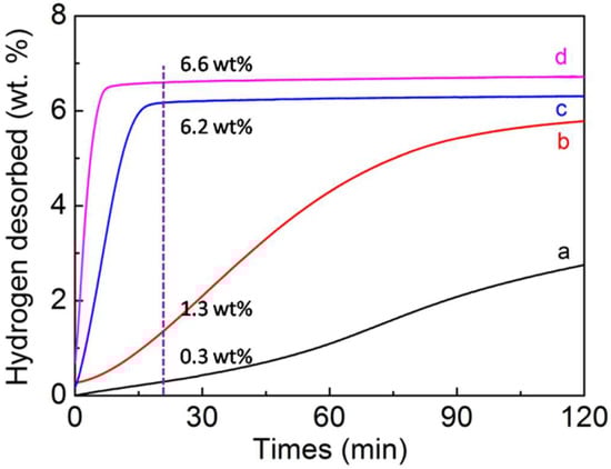 With the approximate exhaustion of traditional fossil fuel and increasing environment concerns, seeking clean renewable energy has become one of the top priorities for scientific researchers [1,2]. Hydrogen energy is deemed to be a promising candidate to supersede conventional energy due to its non-polluting and reproducible features [3,4,5,6]. After Bogdanović and Schwichardi’s breakthrough, solid-state hydrogen storage materials, especially magnesium hydride (MgH2), have become popular to study because of their excellent reversibility, high theoretical capacity (7.6 wt.%) and low cost [7,8,9,10,11,12,13]. Nevertheless, the presence of some obstacles such as high decomposition enthalpy and dehydrogenation temperature, and sluggish kinetics, have definitely hindered further development on the actual utilizations.