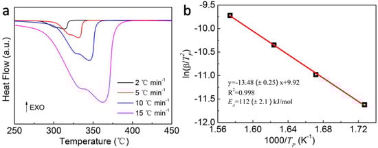 The enhanced hydrogen desorption kinetics were then verified using the DSC measurements at various heating rates to calculate the activation energy of MgH2-4 wt.% Ni@C composites. The DSC plots of MgH2-4 wt.% Ni@C composites at heating rates of 2, 5, 10 and 15 °C min−1 are shown in Figure 5a. There is a broad peak at different heating rates corresponding to the decomposition of MgH2. The dehydrogenation peak temperatures, as recorded in Table 2, rise from 315 °C to 361 °C with the increase of the heating rate. For the MgH2 thermal decomposition reaction, the following equation can be used to calculate the activation energy [34]: