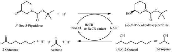 - Xu, G.-P.; Wang, H.-B.; Wu, Z.-L. Efficient bioreductive production of (S)-N-Boc-3-hydroxypiperidine using ketoreductase ChKRED03. Proc. Biochem. 2016, 51, 881–885. [Google Scholar] [CrossRef]