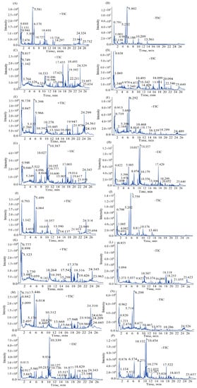According to the previous reports [9,10,11,12], saponins, terpenoids, and flavones are the main chemical components in BR (VPBR), PRA (VPPRA), AFI, and GRM. These components easily lose a proton under mass spectrum detection, resulting in a better mass response in negative ion mode than in positive one. As shown in Table 1, 101 compounds were identified in negative ion mode and 21 compounds were identified in positive ion mode [13,14,15]. The typical total ion chromatograms (TICs) of BR, VPBR, PRA, vinegar-processed PRA (VPPRA), BR-PRA herb-pair, VPBR-VPPRA herb-pair, SNS, and SNS-containing VPBR and VPPRA in both ion modes are shown in Figure 1.