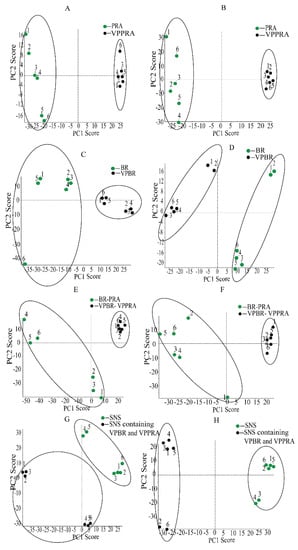 Principal component analysis (PCA) score plots in positive ion mode of PRA and VPPRA (A), BR and VPBR (C), BR-PRA herb-pair and VPBR-VPPRA herb-pair (E), SNS and SNS containing VPBR and VPPRA (G). PCA score plots in negative ion mode of PRA and VPPRA (B), BR and VPBR (D), BR-PRA herb-pair and VPBR-VPPRA herb-pair (F), and SNS and SNS-containing VPBR and VPPRA (H).