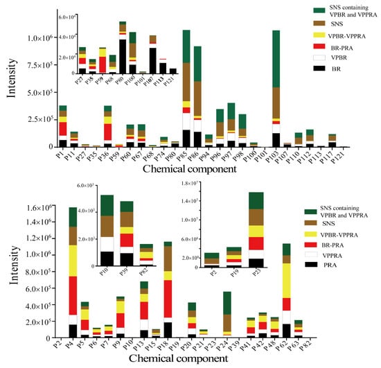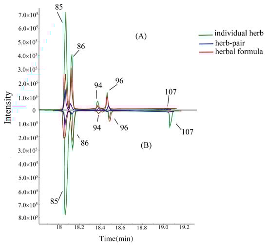 As shown in Table 3, we found that the intensity of SSa and SSd declined but the intensity of SSb2 and SSb1 increased in the BR. SSs, a kind of oleanane type triterpenoid saponin, could be divided into seven types according to their different aglycones. SSa, SSd, and SSc are epoxy-ether saikosaponins (type I), while SSb2 and SSb1 with a different aglycone, form a heterocyclic diene saikosaponin (type II) [19]. The glycosidic bond is very easily hydrolyzed in the acidic conditions or being heated [20,21]. Vinegar processing could promote the hydrolyzation from 13 to 28 allyl oxide linkage to its corresponding heteroannular diene structure, resulting in the aglycone accumulation. As shown in Figure 5, peak No. 94 was clearly observed in VPBR, VPBR-VPPRA herb-pair, SNS-containing VPBR and VPPRA, and SNS, and almost undetectable in BR and BR-PRA herb-pair. According to the fragmentations in both positive and negative ion modes and other reports [22,23,24], we suggested that peak No. 94 is SSg. SSg in SNS could be related to the acidic compounds of herbal formula, such as glycyrrhizic acid. Also, peak No. 68 (SSh/i), as the isomer of SSc, had the same change with SSg. Based on these, we hypothesized that SSa and SSd could be transformed to SSb2, SSb1, and SSg, while SSc could be converted to SSh and SSi after processing and formula compatibility.