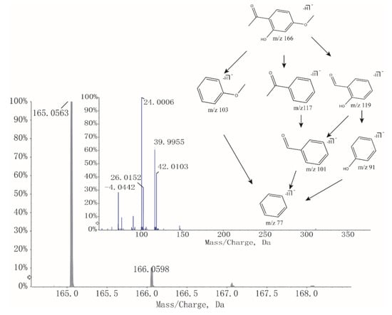 As shown in Table 2, the intensity of paeonol significantly increased after stir-frying with vinegar. According to a previous report [16], adding acid could greatly improve the extraction efficiency of paeonol. Since the boiling point of paeonol is 154 °C, the use of slow fire (130 °C) controlled by infrared radiation thermometer during the processing minimized the loss of paeonol. In addition, acetic acid plays an important role to form intermolecular hydrogen bonds by Van der Waals’ force with paeonol, resulting in the increase of dissolution rate. Modern researches indicate that paeonol has analgesic and antiphlogistic pharmacological activities [17,18] and is consistent with TCM theory that processing of medicinal herbs with vinegar can enhance the effects of promoting blood circulation and relieving pain. As an illustration, Figure 4 revealed the course of deducing fragmentation of paeonol.