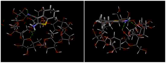 3D demonstration of 6CN-βCD association at its lower energy at two different angles. Dashed lines represent intermolecular hydrogen bonds. The chemical elements are represented by different colors: yellow (sulfur), blue (nitrogen), red (oxygen) and gray (carbon).