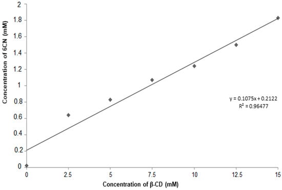 Based on the method described by Higuchi and Connors [13], the phase solubility diagram was obtained for 6CN with different concentrations of βCD, as shown in Figure 3. Since phase diagrams provide evidences of the stoichiometry between drug and cyclodextrin, the phase solubility study is usually the first evidence of an association between cyclodextrin and a drug. The linear equation y = 0.1075x + 0.2122 was then obtained with a linear correlation coefficient (R²) of 0.9648.