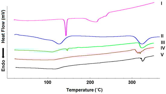 DSC curves for 6CN (I), βCD (II) and 6CN-βCD obtained by PM (III), KND (IV) and ROTA (V). The DSC curves were obtained at a temperature range of 25 to 350 °C, at a heating rate of 10 °C min−1, with dynamic atmosphere of N2 (50 mL min−1).