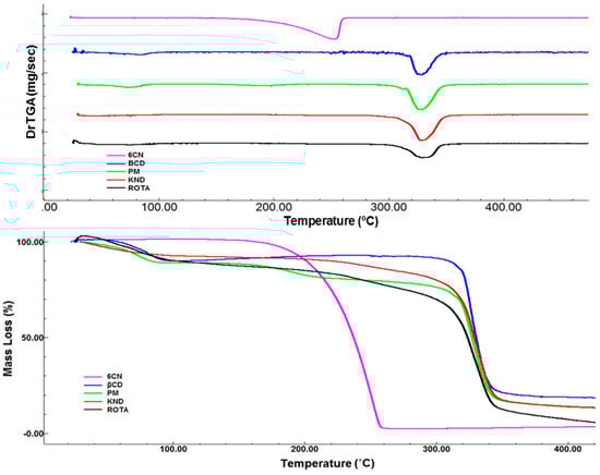 The TG/DTG curves shown in Figure 5 indicate that while 6CN has only a single well-defined mass loss event, all the 6CN-βCD binary systems show more than one mass loss event, where a larger mass loss is observed near 330 °C which resembles that of βCD’s TGA curve.