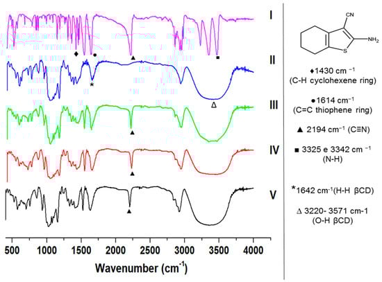 FTIR spectra of 6CN, βCD and 6CN-βCD binary mixtures are shown in Figure 6. The spectrum of 6CN shows two characteristic bands of moderate intensity in the 3325–3342 cm−1 region, which relates to the N–H bond of the primary amine. In addition, bands corresponding to the axial deformation of the C≡N triple bond of the isonitrile group at 2194 cm−1 and to the axial deformation vibration of the C=C double bond of the thiophene ring at 1614 cm−1 are observed. The band at 1430 cm−1 corresponds to the asymmetric deformation of the C–H bonds of the cyclohexene ring. The C–S bond of the 6CN thiophene ring has a low intensity band in the region of 700 to 600 cm−1 being of little value for the determination of the 6CN structure [25].