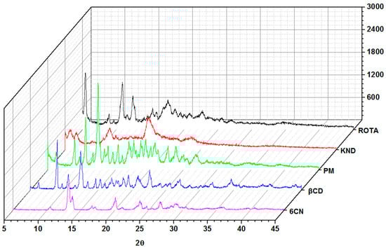 The micrographs shown in Figure 8 indicate that the morphologies of the binary systems are relatively different from those of individual βCD and 6CN molecules. Since a change in the surface morphology and a reduction in particle size were observed with the binary systems, it suggests that an association between 6CN and βCD has occurred. In fact, the appearance of irregular and amorphous forms, in which both the original morphology and sizes of the individual components have changed, might indicate an association between the drug and cyclodextrin, as reported elsewhere [22,34]. The micrograph of the sample obtained by ROTA exhibited the most crystalline profile of all binary systems. On the other hand, the particles of PM and KND are the ones that presented the highest degree of crystalline change when compared to those of 6CN and βCD.
