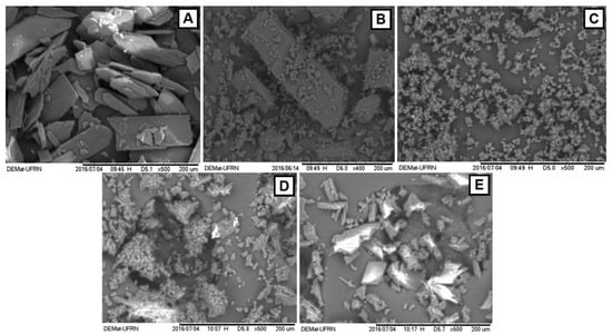 SEM is a qualitative method for evaluating surface texture of solids [19] and therefore, it aims to evaluate the morphology and particle size. The 6CN particles reveal a definite geometric aspect with multilayer-structured crystals of different shapes and sizes (Figure 8), which is attributed to the crystalline character of 6CN as confirmed by the XRD analysis. βCDs are present as irregularly shaped block particles with various dimensions [19] and rhomboid forms, as previously described in the literature [33]. Similar crystalline and homogeneous structures are observed in the micrographs of 6CN-βCD binary systems, where it is possible to observe that such crystals have smaller particle sizes than those of 6CN and βCD alone. The particles of the binary system obtained by ROTA are presented as crystals with block structure.