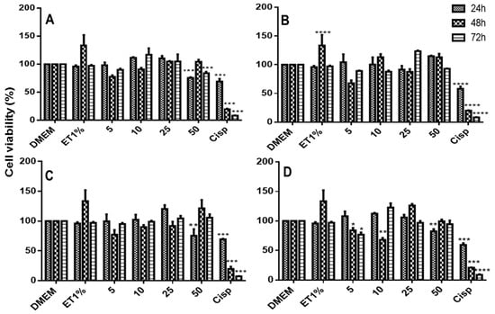 Viability of non-tumoral cells (3T3) as determined by the MTT method after 24, 48, and 72 h of exposure to DMEM (control), ET1% (vehicle), Cisp (50 μM cisplatin as positive control) and 5, 10, 25 and 50 μM of each test sample: 6CN (A) and binary systems obtained by PM (B), KND (C) and ROTA (D). Results were expressed as bar charts showing the mean percentage ± SD (n = 3 for each experimental group). Statistical analyses were performed by one-way ANOVA with Tukey-Kramer post-test using GraphPad Prism version 5.00. A difference in the mean values of of **** p < 0.0001, *** p < 0.001, ** p < 0.01 and * p < 0.05 were considered as statistically significant.