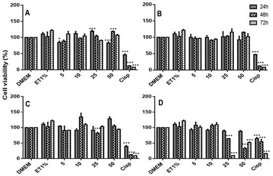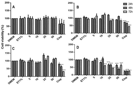 Viability of renal carcinoma cells (786-0) as determined by MTT method after 24, 48, and 72 h of exposure to DMEM (control), ET1% (vehicle), Cisp (50 μM cisplatin as positive control) and 5, 10, 25 and 50 μM of each test sample: 6CN (A) and binary systems obtained by PM (B), KND (C) and ROTA (D). Results were expressed as bar charts showing the mean percentage ± SD (n = 3 for each experimental group). Statistical analyses were performed by one-way ANOVA with Tukey-Kramer post-test using GraphPad Prism version 5.00. A difference in the mean values of *** p < 0.001, and * p < 0.05 were considered as statistically significant.
