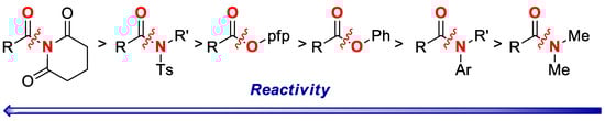- Meng, G.; Szostak, M. N-Acyl-Glutarimides: Privileged Scaffolds in Amide N–C Bond Cross-Coupling. Eur. J. Org. Chem. 2018, 20–21, 2352–2365. [Google Scholar] [CrossRef]