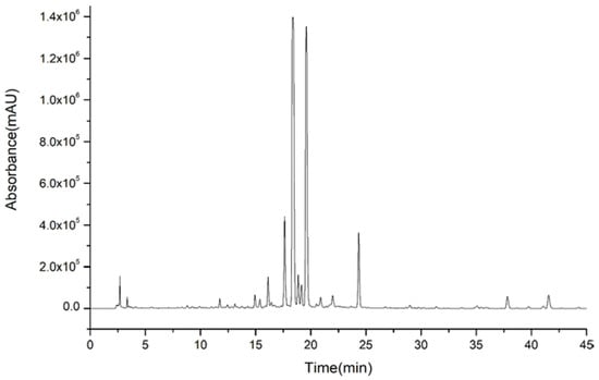 D101 macroporous resin is commonly used to separate and purify natural product [7]. Firstly, it can remove non-adsorbent components such as polysaccharides and proteins from extracts. On the other hand, they can separate compounds by gradient elution and enrich some low-content components. Experiments showed that D101 macroporous resin could separate and enrich chemical compounds from AF. The elution effect of ethanol at different concentrations is shown in Figure 2. It can be seen in Figure 2a that the chromatographic peaks in 70% ethanol eluent mainly appeared before 25 min, and the chromatographic peaks after 25 min were all in the 95% ethanol eluent and were effectively enriched as shown in Figure 2b.