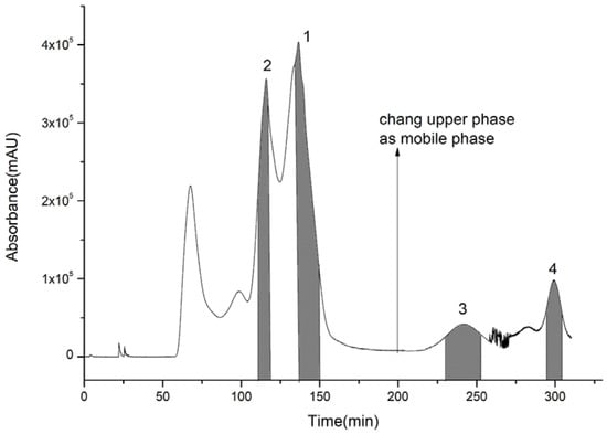 HSCCC is an efficient instrument for the isolation of chemical compounds from natural sources. The two-phase solvent system, flow rate, temperature, and rotation rate are essential factors that can impact the productivity of the HSCCC purification. For example, the solvent system affects the K-values of compounds that are closely related with purity, low flow rate generates good separation, but requires a long isolation time and more mobile phase organic solvent, and the speed of revolution and the temperature affect the retention rate of stationary phase [13]. Therefore, referring to the reported literatures [14,15] and combining with our previously optimal separation conditions, the multilayered coils were first entirely filled with the upper stationary phase at a flow rate of 5.0 mL/min, and the flow rate of the mobile phase (2.0 mL/min), the temperature (20 °C), and the rotation rate (900 rpm) were determined for the optimum isolation.
