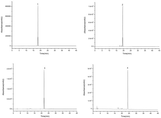 For the first step of HSCCC isolation, a series of solvent systems at varied proportions were tested. The K-values of four target compounds were tested via HPLC analysis as shown in Table 2. The K-values of the four compounds were ideal between 0.5 and 5 in Systems 3 and 4. However, when System 4 was performed, the purity of compounds 1 and 2 was lower than that of System 3. System 3 was adopted for isolation, and the retention rate of the upper phase was close to 64%. It was still found that compound 4 could not be eluted after System 3 was operated at the flow speed of 2.0 mL/min for 350 min. Therefore, the pump was stopped when the lower phase ran for about 200 min, and then the upper phase was replaced as the mobile phase. Because the solubility of compounds 3 and 4 in the upper phase was high, and K3 was higher than K4, compound 3 eluted before compound 4, and the operation was controlled in 320 min which greatly shortened the preparation time and reduced the amount of solvents. Compounds 1 (130–150 min), 2 (110–118 min), 3 (230–251 min), and 4 (295–303 min) were collected according to the peak shapes as shown in Figure 3. The collected fractions were condensed and dried, and then the contents of compounds 1, 2, 3, and 4 were calculated by area normalization at 28, 13, 5, and 3 mg with 98.5%, 95.1%, 97.7%, and 92.4% purity, respectively (Figure 4).