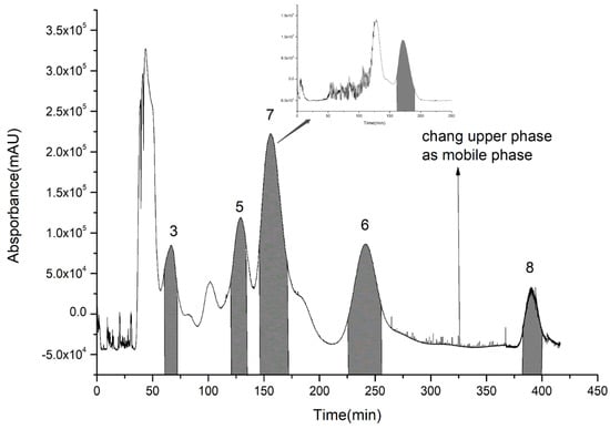 For the second step of HSCCC isolation, the HSCCC solvent systems were screened by K-value determination as shown in Table 3. In the systems consisting of n-hexane, n-butanol, methanol (ethanol), and water, K-values of compounds 5–8 were suitable. However, compounds 7 and 8 with high purity could only be obtained from System 8, while compounds 3, 5, 6, and 8 with high purity could be obtained from System 7. Therefore, compounds 3, 5, 6, 7, and 8 were isolated from System 7, and then compound 7 was further purified by System 8. As in the first step, because of the high K-value of compound 8, the upper phase was changed into the mobile phase at about 320 min. Compounds 3 (63–74 min), 5 (122–132 min), 7 (148–174 min), 6 (226–253 min), and 8 (383–400 min) were collected according to their chromatographic peak shapes and lyophilized as shown in Figure 5. Then, compound 7 was further purified by System 8. The contents of compounds 3, 5, 6, 7, and 8 were calculated by area normalization method at 3, 4, 5, 10, and 7 mg with 95.8%, 98.5%, 95.1%, 92.4%, and 97.7% purity, respectively (Figure 6).