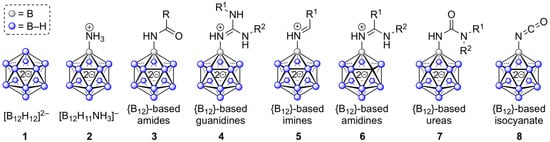 Since the isolation of 1 in 1960 [], many routes to substituted closo-dodecaborate anions have been reported via the construction of B–N, B–O, B–S, B–Hal or B–C bonds [], and the ammonium dodecaborate [B12H11NH3]− (2) serves as one of the fundamental building blocks for further functionalization []. Monoanionic 2 can be synthesized from the reaction of 1 with hydroxylamine-O-sulfonic acid (H2N-SO3H) on a multi-gram scale [,,]. The –NH3 site can be deprotonated under basic conditions and then combined with acyl chlorides, carbodiimides or aldehydes to afford the corresponding amides 3 [,,,,], guanidines 4 [] and imines 5 []. Dodecaborate amidines 6 have not been explored yet, and urea derivatives 7 were unknown until we recently found that the reaction of 2 with dialkylcarbamoyl chlorides ClC(O)NMe2 or ClC(O)NEt2 affords the corresponding {B12}-substituted N,N-dialkyl ureas []. The isocyanate derivative 8 was originally synthesized from the reaction of the carbonyl derivative [B12H11(CO)]− with NaN3 but characterized only by 11B-NMR and IR spectroscopy []. Herein we present: (1) the synthesis of three new {B12}-based amidines 6 with two crystal structures; (2) six crystal structures of {B12}-based amides 3 and a simple approach for the interconversion between their dianionic and monoanionic forms; (3) the synthesis of two new {B12}-based aromatic ureas 7; (4) a new route to isocyanate 8 and its crystal structure.