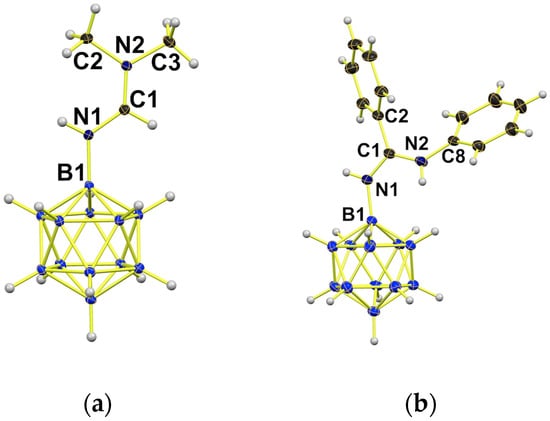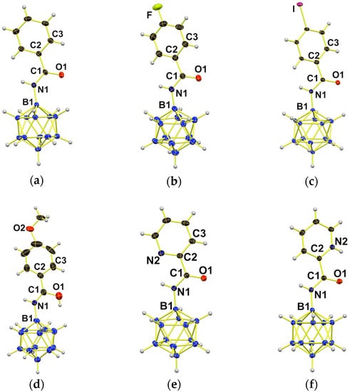 {B12}-based amides 3 were originally synthesized by other groups [,,,]. The products were isolated in their O-protonated form 3-H, and there was only one crystal structure reported, namely 3a-H with R = Ph (Scheme 2). Our group recently modified the reaction conditions, and the products were obtained in up to 95% yields in the O-deprotonated form 3 after chromatography on silica gel []. Our approach uses smaller amounts of acyl chlorides and a slight excess of sodium hydride base, which results in the isolation of the dianionic form (for this study, 3a–d were resynthesized according to [] in order to probe their solid-state structures). Adjustment of the pH value with diluted hydrochloric acid during the work-up or after isolation leads to 3-H in their O-protonated form. Back-conversion to 3 can be achieved by dissolution in MeCN, treatment with Et3N and distillation of all the volatiles. Pyridine-substituted 3e was synthesized as a new product. Since purification by chromatography proved difficult, it was isolated as 3e-H in 50% yield upon acidic work-up and recrystallization from methanol. Conversion to 3e occurred quantitatively using the above-mentioned procedure. In contrast to previously described amides, protonation of 3e takes place at the pyridine ring, indicating the higher basicity of the heterocycle as compared to the amide moiety. The 11B{1H}-NMR spectra of 3b, 3b-H, 3e and 3e-H are shown in Figure S1 as representative examples to demonstrate the effect of protonation. For R = Ph (3a), 4-F-C6H4 (3b), 4-I-C6H4 (3c) 4-MeO-C6H4 (3d-H), 2-pyridyl (3e) and 2-pyridyl-H (3e-H), crystal structures were elucidated, and selected structural features are discussed below.