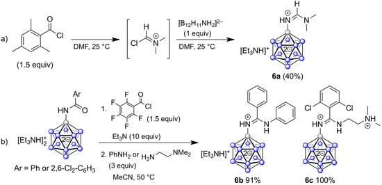 Amidine derivatives based on the {B12} cluster have not been reported before, and in the following, methods to synthesize them are presented. Combination of dimethyl formamide with 2,4,6-trimethylbenzoyl chloride afforded the chloroiminium intermediate, which upon attack by [B12H11NH2]2− afforded 6a (Scheme 1a). This reaction allowed for the isolation of the desired product; however, the yield of 40% was moderate, and furthermore extension of the substrate scope by this method did not appear convenient. Using a related strategy, we found that the carbonyl group of {B12}-based amides can be activated by pentafluorobenzoyl chloride, and subsequent attack by amines would then lead to {B12}-based amidinium ions (Scheme 1b). Following this approach, products 6b and 6c were isolated in excellent yields of 91% and 100%, respectively.