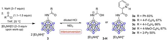 Synthesis of {B12}-based amides 3 and interconversion between their dianionic and monoanionic forms; compounds 3a–d were prepared according to [].