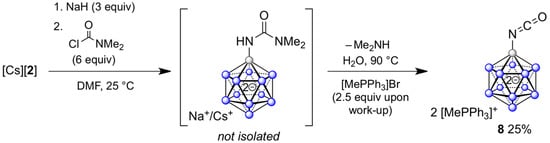 Isocyanates are important intermediates in organic synthesis that are used in the manufacture of, e.g., agrochemicals and polyurethanes []. Only one publication by Alam and coworkers from 1989 mentioned the isolation of dodecaboranyl isocyanate 8 []. It was prepared via the reaction of [B12H11(CO)]− with NaN3 and analyzed by 11B-NMR and IR spectroscopy. However, further characterization was not given, and in particular the crystal structure was not reported. Because the isocyanate moiety serves as versatile functional group handle capable of providing access to a number of novel {B12}-based derivatives, we were interested in resynthesizing 8. However, multiple attempts to reproduce the original procedure were not successful in our laboratory, and we therefore sought to establish an alternative route. Since dodecaboranyl N,N-dialkyl ureas can be prepared easily [], their thermal fragmentation appeared as an attractive strategy. Indeed, treatment of 2 with base and ClC(O)NMe2 to give the intermediate urea, followed by heating in water, afforded 8 in 25% overall yield (Scheme 4). The yield of this sequence is rather low, and efforts to improve the protocol are ongoing.