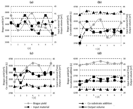 The weekly average biogas yield was calculated using the formula: Y = (Vav/Mav), where: Y is a biogas yield [m3/Ton], Vav is a biogas daily volume average over the course of a week [m3] and Mav is a daily feeding amount average over the course of a week (Ton).