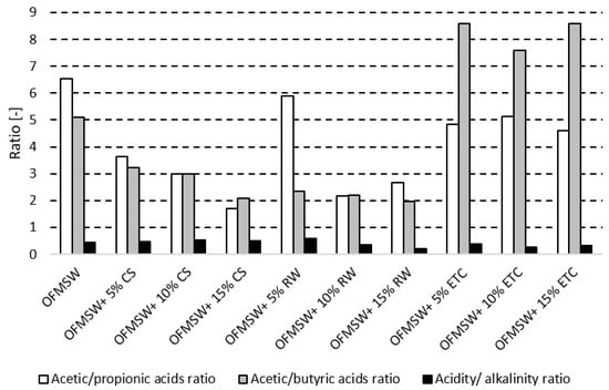 Fatty acids’ concentrations and acidity/alkalinity ratios for single substrate AD with the OFMSW and the AD with addition of different types of co-substrates: corn stillage (CS), restaurant wastes (RW), and effluents from the cleaning of chocolate transportation tanks (ETC).