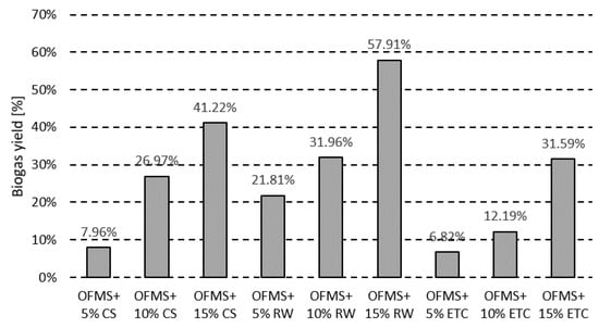 Based on these results, it can be observed that co-digestion of OFMSW with organic-matter-rich wastes is an appropriate method for process efficiency improvement. However, it should be limited. The 15% addition of effluents from the cleaning of chocolate transportation tanks resulted in an increase in biogas yield by 31.6%, to 134.6 L/Kg, corresponding to a 68.5 kWh electricity production possibility. Introduction of 10% corn stillage as the feedstock resulted in a biogas yield increase of 27.0%, to 129.9 L/Kg, corresponding to a 58.5 kWh electricity production possibility. The 5% addition of restaurant waste contributed to a biogas yield of 124.5 L/Kg (21.8% increase), corresponding to a 47.1 kWh electricity production possibility.