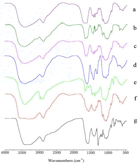 FTIR spectra of: (a) chitin; (b) CS-D3; (c) CS-M1; (d) CS-S1; (e) CS-S2; (f) CS-A2; (g) CS-A3.