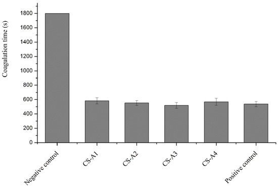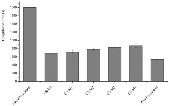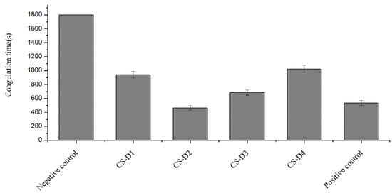 Chitosan possesses a large number of amino and hydroxyl groups that permit it to be easily modified by chemical processes such as acylation, N-phthaloylation, alkylation, Schiff base formation, reductive alkylation, tosylation, O-carboxymethylation, N-carboxyalkylation, and graft copolymerization [38]. Although there were numerous studies on chitosan-based composite materials as surgical hemostatic agents, to the best of our knowledge, there were limited numbers of studies on the hemostatic capacity of single chitosan substituted compounds. The effect on blood coagulation time of chitosan with different SGs was investigated in vitro, as shown in Figure 5. The investigation results revealed that chitosan and its substituted derivatives had significant in vitro procoagulant effect when compared with the negative control group. Relative to chitosan (CS-D3), water-soluble substitution (CS-S1 and CS-S2) enhanced the procoagulant effect. It was probably because water-soluble substitution improved the protonation ability of amino groups in the molecular chain of chitosan. Although the hemostatic mechanism of chitosan has not been clearly defined, many studies demonstrated that the procoagulant performance of chitosan involved the agglutination of red blood cells (RBCs). The more positively charged the amino group on CS, which attracted the negatively-charged RBCs to agglutinate, the more easily clotting is promoted. Compared with chitosan (CS-D3), chitin with 90% acetyl substituent had a higher procoagulant effect due to its strong platelet attraction to promote coagulation [39]. Studies showed that chitin might retain platelets to form a structure similar to a platelet/fibrin mesh structure that can promote blood coagulation, which was related to its unique β-crystalline structure [40].