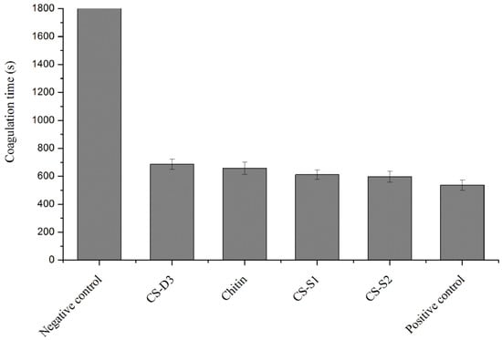 The plasma recalcification time was determined according to the method described in the literature [54] with a few modifications. Briefly, the New Zealand rabbit blood was collected with an evacuated blood tube containing sodium citrate as an anticoagulant (volume ratio of anticoagulant to blood: 1:9) and centrifuged at 3000 rpm for 15 min (Certificate No. SYXK20150147). Afterwards, the supernatant was separated to obtain platelet-poor plasma (PPP). To each Eppendorf tube, 100 µL of PPP was added and then 100 µg of chitosan powder was added as the experimental group. Yunnan Baiyao powder and a blank tube were used as the positive and negative control group, respectively. All the tubes were incubated in a 37 °C water bath for 3 min and then 0.1 mL of 0.025 mol/L calcium chloride solution was added, well mixed, and placed in a 37 °C water bath again while the stopwatch was started until white jelly began to occur in the mixed solution.