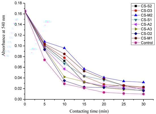 A proper amount of water-insoluble chitosan was dissolved in 1% acetic acid aqueous solution and a proper amount of water-soluble chitosan was dissolved in deionized water to prepare 10 mg/mL sample solutions. The above sample solutions (1 mL) were added to the watch glass and placed in a vacuum drying oven to form films through vacuum drying. Films prepared with water-insoluble chitosan were soaked in 0.1 mol·L−1 sodium hydroxide solution for 10 min, washed with distilled water until the washing solution was neutral, and then vacuum dried again. To each watch glass, 0.5 mL of fresh anticoagulant rabbit blood and 50 uL of calcium chloride solution (0.25 mol·L−1) were added while the stopwatch started at the same time. Every 5 min, 100 mL of distilled water was slowly poured into the watch glass. Injection fluid was collected and centrifuged. The supernatant was measured for absorbance at 540 nm. The surface of the watch glass was directly used as the positive control. The dynamic coagulation curve of blood contact time versus absorbance was drawn.