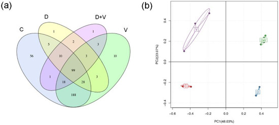 PCA was used to summarize factors mainly responsible for the differences in OTU composition in different samples. When several samples from the same group show a kind of aggregated distribution pattern, it implies a high homogeneity in the individual group. The distance between different groups displays the variance of OTU composition between groups. According to the aggregation distribution of samples within groups, the results of PCA showed that the samples in groups C, D, and D + V had better homogeneity. The four groups were separated into four quadrants, which represented the distinct variance of OTU composition among the four groups. Therefore, the results of the OTU Venn chart and PCA showed that there were significant differences in OTU numbers and composition in the four groups (Figure 2b).