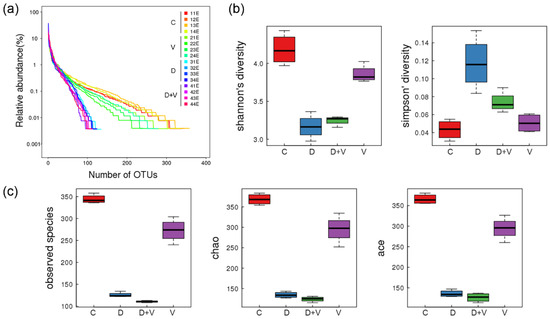 Diversity analysis. (a) OTU rank curve of each sample. The width of the x-axis in the chart displays the species richness, while the species evenness is derived from the slope of the line. A longer curve on the horizontal axis means the species is more abundant in the sample. A flatter curve indicates that the species composition of the sample is more homogeneous. The smoothness of the curve shows the diversity of the sample. A smooth curve indicates a sample with high diversity, while a rapidly descending curve implies a high proportion of dominant bacteria and low diversity. (b) Boxplots of the Shannon and Simpson indexes of alpha diversity indexes among groups to reflect the species diversity of the community. (c) Boxplots of the observed species, Chao, and Ace indexes of alpha diversity indexes among groups to reflect the species richness of community. The complexity of the sample is proportional to the observed species, Chao, Ace, and Shannon indexes, with a negative correlation with the Simpson value. When the species richness is the same, the greater the species evenness, and the greater the community diversity will be. Group designations were as follows: control (C); virus infection model (V); dysbacteriosis model (D); dysbacteriosis and virus infection (D + V).
