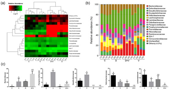 Species composition and abundance of intestinal flora. (a) Log-scaled percentage heat map at the family level. Longitudinal clustering indicates the similarity of all species among different samples, while the horizontal clustering indicates the similarity of certain species among different samples. The closer distance and the shorter branch length represent the similarity of the species composition between the samples. (b) The taxonomic composition distribution in samples at the family level. The taxonomic composition distribution histograms of each sample were shown at the family level and directly displayed as the ratio of each species. The species with abundance lower than 0.5% were classified into “others”. (c) Statistical results of microflora with significant changes at the family level, including Bacteroidaceae, Paraprevotellaceae, Desulfovibrionaceae, Helicobacteraceae, and Lachnospiraceae. * p < 0.05 compared with group C; Δ p < 0.05 compared with group V. Group designations were as follows: control (C); virus infection model (V); dysbacteriosis model (D); dysbacteriosis and virus infection (D + V).