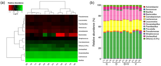 Microbial diversity and species abundance of pulmonary flora. (a) Log-scaled percentage heat map at the genus level. Longitudinal clustering indicates the similarity of all species among different samples, while the horizontal clustering indicates the similarity of certain species among different samples. The closer distance and the shorter branch length represent the similarity in the species composition between the samples. (b) The taxonomic composition distribution in samples at the genus level. The taxonomic composition distribution histograms of each sample were shown at the genus level and directly displayed as the ratio of each species. The species where abundance was lower than 0.5% were classified into “others”. Group designations were as follows: control (C); virus infection model (V); dysbacteriosis model (D); dysbacteriosis and virus infection (D + V).