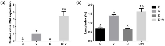 Relative expression of viral RNA in the lung and the lung index. (a) Relative expression of viral RNA in the lung. Each sample was run in triplicate and averaged to ensure accuracy. The 2−ΔΔCT method was used for analysis of the relative virus amplification. The values of groups C, D, and D + V represent the fold change relative to group V which was converted to 1. (b) Lung index. The formula used was as follows: lung index = (lung weight/body weight) × 100%. * p < 0.05 compared with group C; Δ p < 0.05 compared with group V. Group designations were as follows: control (C); virus infection model (V); dysbacteriosis model (D); dysbacteriosis and virus infection (D+V).