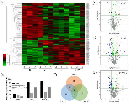 Changes in microRNA (miRNA) expression profiles as indicated by miRNA microarray analysis. (a) Heat map of the union of differentially expressed miRNAs between group V vs. C, group D vs. C, and group D + V vs. C. (b) Volcano plots of differentially expressed miRNAs between groups V and C. (c) Volcano plots of differentially expressed miRNAs between groups D and C. (d) Volcano plots of differentially expressed miRNAs between groups D + V and C. (e) Histogram of differential expression of miRNAs. (f) Venn chart of the intersection of differentially expressed miRNAs between group V vs. C, group D vs. C, and group D + V vs. C. In the Figure 7b–d, the blue dots represent the downregulated miRNA expression (fold change ≥ 1.5 and p ≤ 0.05), and the red dots represent the upregulated miRNA expression (fold change ≥ 1.5 and p ≤ 0.05). The grey dots have no statistical significance (p > 0.05). The green dots show a not obvious difference (fold change < 1.5 and p < 0.05).